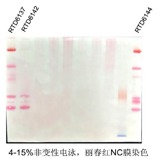第一種方法:凝膠轉(zhuǎn)膜后用麗春紅染色液(貨號(hào):RTD6301)染膜,可以看到Marker條帶,順便可以檢測(cè)轉(zhuǎn)膜效率,然而要注意的是麗春紅染色靈敏度比較低,可能不能完全看到完整的Marker條帶。