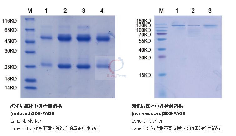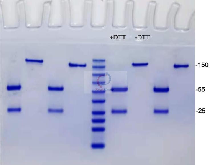 如需測定目標蛋白的純度及分子量(為多聚體分子量),則一般采用非還原SDS-PAGE:采用該電泳方法,二聚體、多聚體在凝膠中的位置會處于單體分子量2倍或多倍的位置,利于觀察及各組分的定性定量分析。當然這種蛋白的聚體形成是依靠二硫鍵來維持的。