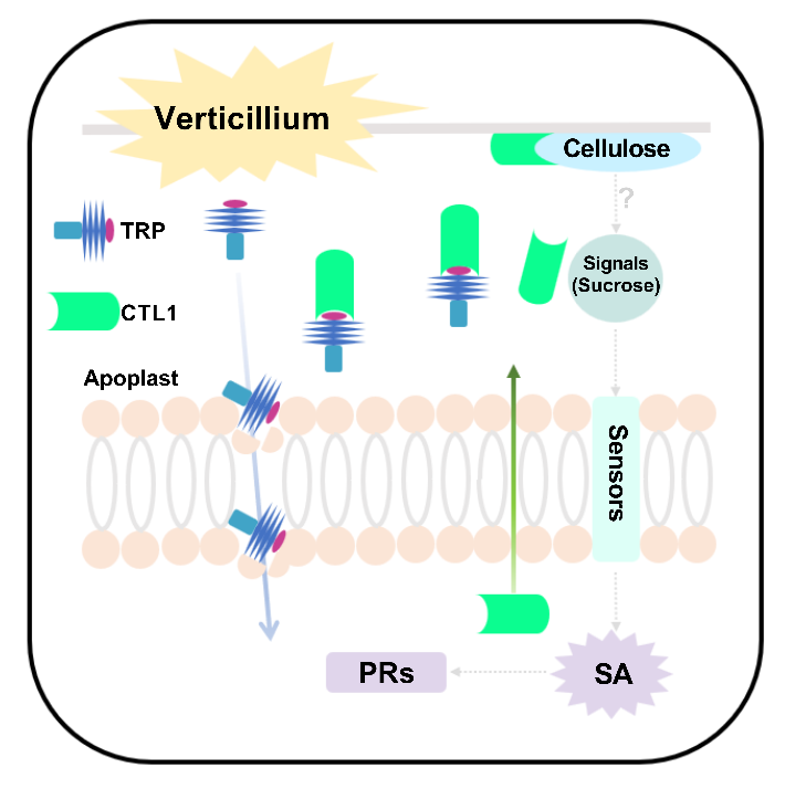 質外體蛋白CTL1阻止新型毒蛋白VdTRP破壞細胞膜,誘導植株提高免疫,增強棉花對黃萎病抗性的工作模式圖
