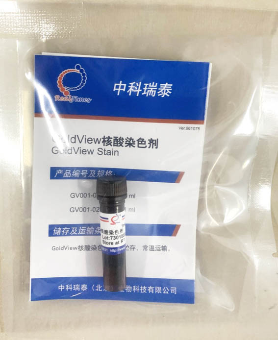 GoldView 是一種可代替溴化乙錠(EB)的新型DNA染料,其靈敏度與EB相當,使用方法與之完全相同。在紫外燈下雙鏈DNA呈現(xiàn)綠色熒光。通過小鼠皮下注射實驗,尚未發(fā)現(xiàn)GoldView有致癌作用。