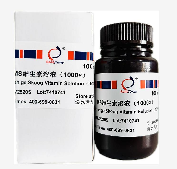 MS維生素溶液是培養(yǎng)基組份中維生素的單獨混合物,濃度為1000×,該溶液已經(jīng)抽濾除菌,可以直接添加到培養(yǎng)基中,建議1升培養(yǎng)基中加入1 ml MS維生素溶液。