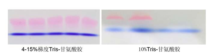 2. 一般說來,電泳中紅色染料泳動速度快于溴酚藍,但在高濃度SDS-PAGE膠中(高于