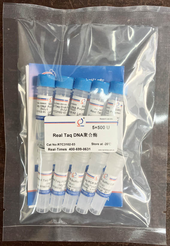 DNA Polymerase是從克隆有Thermu aquaticus DNA Polymerase基因的大腸桿菌經(jīng)誘導表達后分離純化的,其分子量為94 KD。具有5’-3’DNA聚合酶活性和5’-3’外切核酸酶活性,無3’-5’外切酶活性。在PCR反應中,Real Taq DNA Polymerase延伸速度為1-2 kb/分鐘,產(chǎn)物3’端帶A,可直接用TA載體克隆。