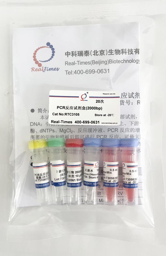 PCR MasterMix包含Taq DNA聚合酶、dNTPs、MgCl2、反應(yīng)緩沖液、PCR反應(yīng)的增強(qiáng)劑和優(yōu)化劑以及穩(wěn)定劑。使用時(shí),只需補(bǔ)加實(shí)驗(yàn)所需的引物和模板后即可進(jìn)行PCR反應(yīng),可最大限度的減少人為誤差,具有快速簡便、穩(wěn)定性好等優(yōu)點(diǎn)。使用本試劑盒進(jìn)行PCR反應(yīng)后,PCR產(chǎn)物大小應(yīng)為2000bp。