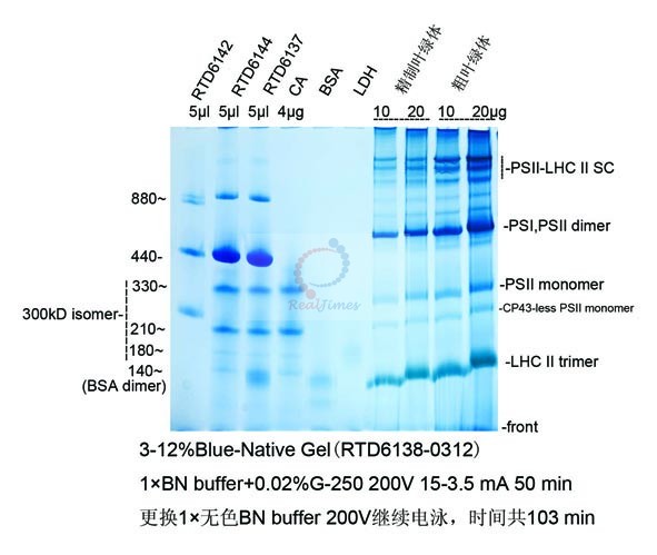 2. 該產(chǎn)品不含蛋白凝膠制備試劑,您可以選擇非變性PAGE凝膠制備及電泳試劑盒(貨號:RTD6130)或者蛋白預(yù)制膠(貨號RTD6118)。如自備試劑,經(jīng)典Laemmli系統(tǒng)中把制膠溶液、電泳緩沖液和上樣緩沖液中的SDS和還原劑(DTT或β-巰基乙醇)全部去除即可進行非變性電泳。