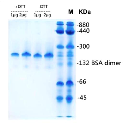 本產(chǎn)品有4種蛋白組成,分子量范圍為45-880 kD,經(jīng)過非變性電泳后,用考馬斯亮藍染色后可以得到5條主帶。
