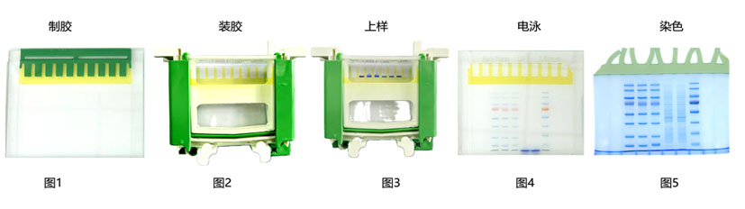 圖1和圖2為使用PAGE上層膠黃色染料配制的上層膠被染成黃色,上樣孔一目了然,易于判斷上樣孔是否歪曲或破損;圖3是上樣后的效果圖,上層膠和樣品非常清晰;圖4為預染蛋白分子量Marker電泳后的效果,染料保留在上層膠中,不會隨著電泳而遷移;圖5為凝膠染色后的效果,樣品分離清晰,泳道無豎條拖尾,染料不影響電泳結果。