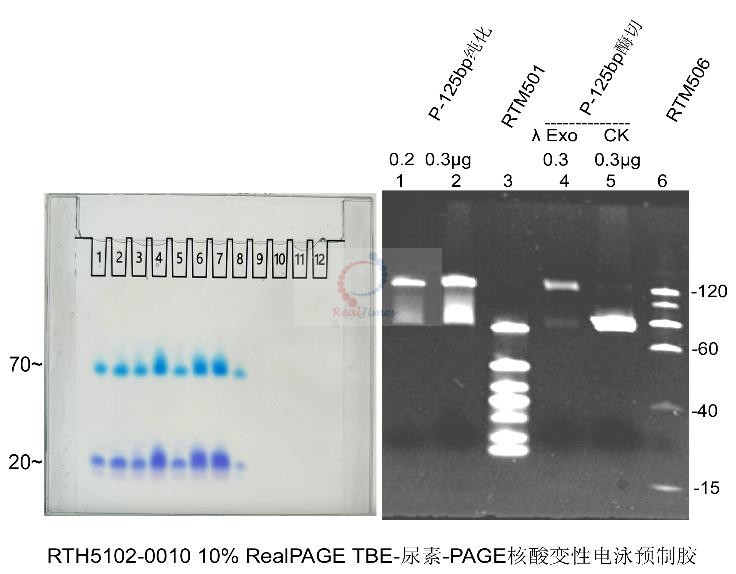單鏈DNA或RNA樣品可以用單鏈DNA PAGE電泳染色試劑盒(貨號:RTS5103),核酸PAGE電泳染色試劑盒(貨號:RTS5102)或核酸快速高靈敏度染色試劑盒(貨號:RTS5101)染色均可以得到清晰的條帶分離效果。注:如果使用核酸染料染色,RealSafe Red(貨號:GR002)或RealSafe All(貨號:GR004)核酸染料結(jié)合單鏈核酸效果最佳,強烈建議使用以便獲得最佳效果的膠圖。其余染料如GelRed,Goldview,EB等染色效果不好。