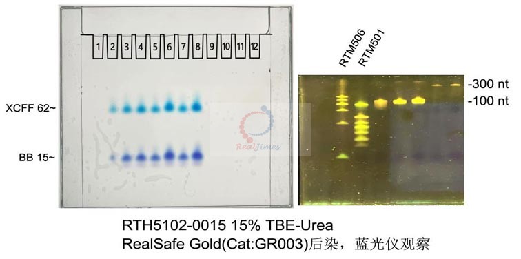 單鏈DNA或RNA樣品可以用單鏈DNA PAGE電泳染色試劑盒(貨號(hào):RTS5103),核酸PAGE電泳染色試劑盒(貨號(hào):RTS5102)或核酸快速高靈敏度染色試劑盒(貨號(hào):RTS5101)染色均可以得到清晰的條帶分離效果。注:如果使用核酸染料染色,RealSafe Red(貨號(hào):GR002)或RealSafe All(貨號(hào):GR004)核酸染料結(jié)合單鏈核酸效果最佳,強(qiáng)烈建議使用以便獲得最佳效果的膠圖。其余染料如GelRed,Goldview,EB等染色效果不好。