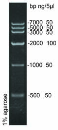 本產(chǎn)品是由6條精準(zhǔn)定量的帶狀雙鏈DNA條帶組成,適用于瓊脂糖凝膠電泳中DNA條帶的定量分析。產(chǎn)品中已含有1×loading buffer,可根據(jù)實驗需要,直接取2-5μl電泳,使用方便,電泳圖像清晰。6條帶的大小分別為500bp,1000bp1500bp,3000bp5000bp,8000bp,其中3000bp條帶最亮,含量為100ng/5μl,其余條帶濃度為50ng/5μl。