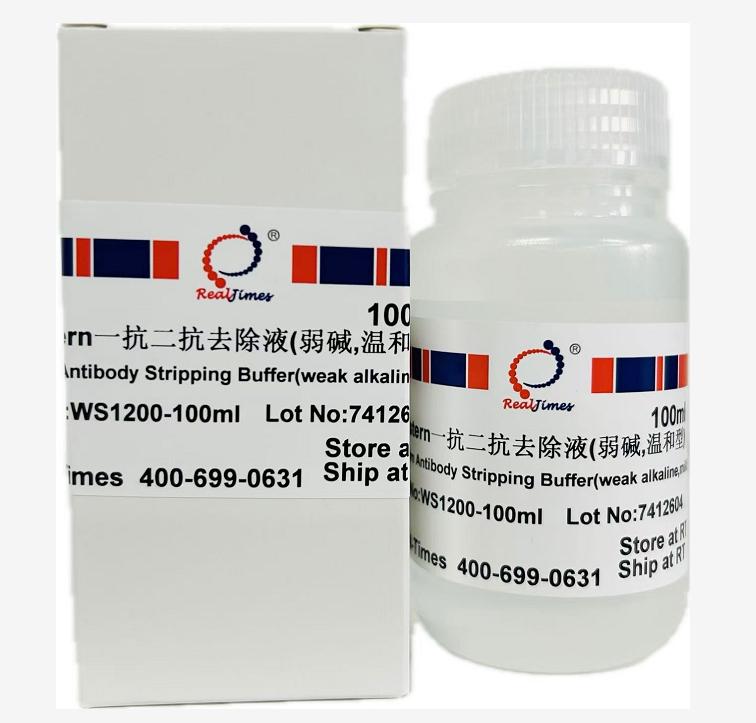 Western一抗二抗去除液(弱堿,溫和型)(Western Antibody Stripping Buffer,weak alkaline,mild type)可以高效去除印跡膜上的一抗和二抗,而吸附在膜上的抗原基本不受影響,用于Western中轉(zhuǎn)移了蛋白膜的重復(fù)利用,可以轉(zhuǎn)一次膜,做多次Western印跡實驗,通常可以重復(fù)利用膜5-8次(PVDF膜)。使用本試劑只需大約30分鐘即可實現(xiàn)蛋白膜的重復(fù)使用,然后可以進行Western的后續(xù)操作。